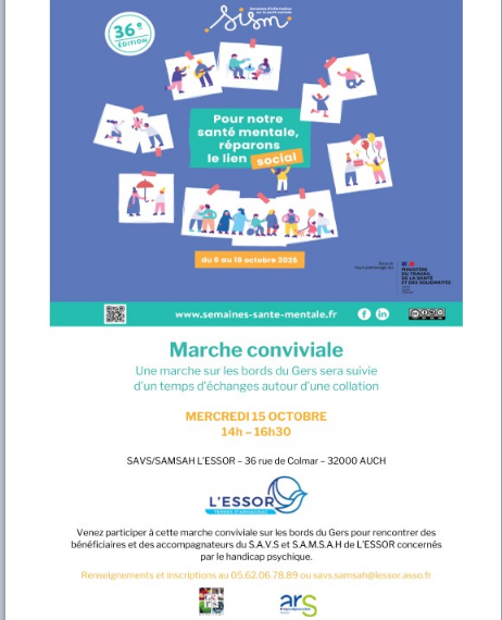 À l’occasion des SISM 2025, le SAVS-SAMSAH d’Auch de L'ESSOR Terres d’Armagnac vous invite à un moment de rencontre et de partage autour de la santé mentale.
